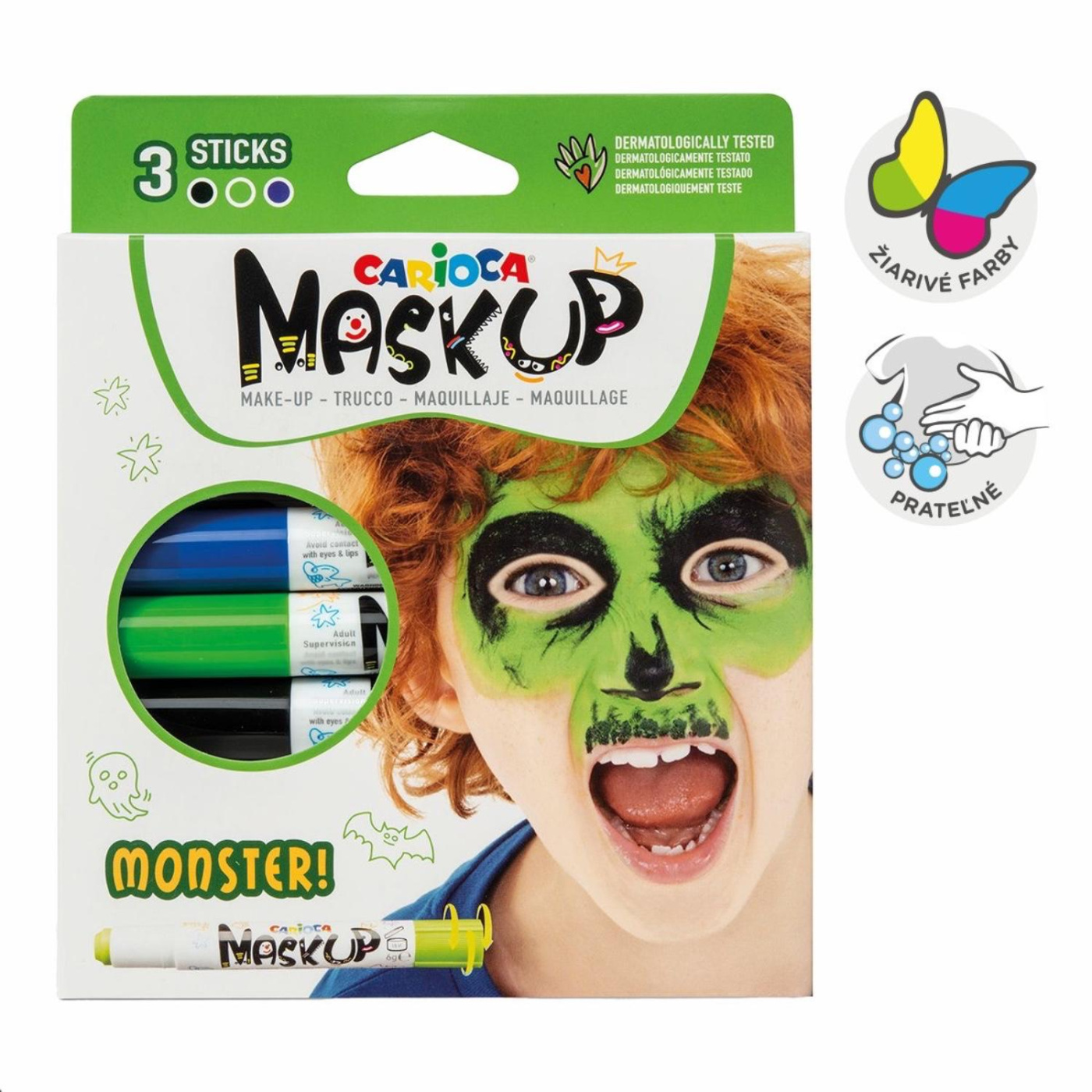 Sada barev inspirovaná strašidelnými příšerami a monstry. Snadné míchání, které umožňuje vytvářet nekonečné množství odstínů. Jednoduše otočte tyčinku a naneste na pokožku. Podrobný návod na zadní straně krabičky. Nevhodné pro děti mladší 3 let.