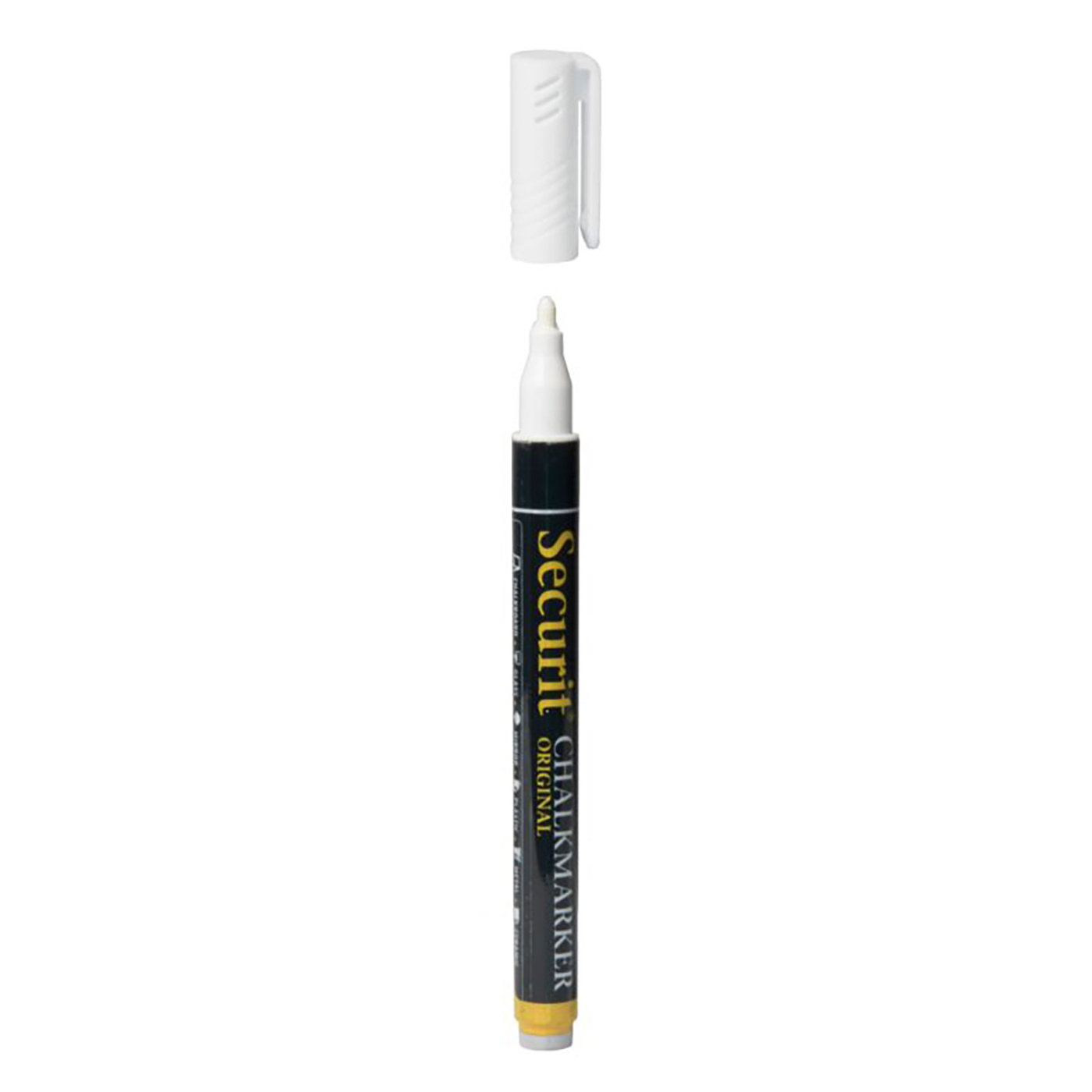 Křídový fix Securit má rovný hrot o velikosti 1 - 2 mm podle použité plochy.